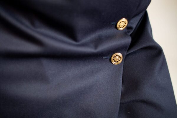 Magnifique jupe portefeuille bleu nuit avec quatre boutons, d'après un patron original des années 50. Laine 45%, acron 55%, doublure 100% viscose. Tailles disponibles : 34, 36, 38, 40, 42, 44